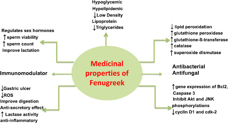 Trigonella foenum graecum (fenugreek) belongs to the family Fabaceae. It is a medicinal herb used to treat various diseases, such as diabetes, inflammation, cancer, hypercholesteremia, reproductive dysfunction, and neurodegenerative disorders. For centuries, fenugreek seeds have been used as carminative, demulcent, expectorant, laxative, and stomachic agents [1]. It originated in Eastern Europe but is now grown all over the world. It has a variety of phytochemicals, such as flavonoids, alkaloids, coumarins, vitamins, carbohydrates (Galactomannan), saponins, trigonelline, diosgenin, and soluble fibers, which are responsible for the pharmacological effects. Numerous clinical and pre-clinical studies have revealed its anti-diabetic, anti-sterility, and anti-fertility effects. Moreover, it regulates the production of enzymes that control blood sugar levels and help in reducing cholesterol [2]. The hypoglycemic action of fenugreek corresponds to physiological requirements and is mediated by Glucogen-like peptide-1 levels [3]. Furthermore, it also regulates antioxidant and detoxifying enzymes to reduce oxidative stress. The flavonoids and saponins present in fenugreek prevent tumor formation by blocking carcinogen-DNA adduct formation [4]. Flavonoids and alkaloids are well known for their neuroprotective and antioxidative effects [5, 6]. The active components of fenugreek, i.e., 4-hydroxyisoleucine (4-OH-Ile) and galactomannan, have been reported to reduce blood glucose levels and improve lipid metabolism in vivo [7]. Trigonelline regulates ß cell regeneration, insulin secretion, enzymes involved in glucose metabolism, and neuron excitability [8]. Diosgenin suppresses tumor necrosis factor-induced invasion, suppresses proliferation, and enhances apoptosis. Fenugreek seeds are effective in boosting both total and free testosterone, sperm cells count, and sperm motility, thus promoting physical and sexual health [9]. Research studies have confirmed the traditional use of fenugreek in treating various health problems, such as diabetes, reno-protective properties in diabetic complications, and gastric ulcers. It is also recommended to be used as a protein supplement (about 20-30%) as it contains a high level of protein [10].