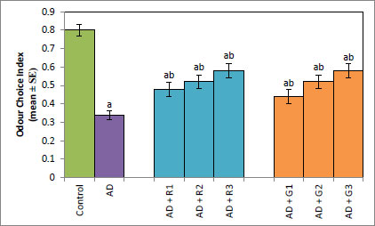 Fig. (1a). Effect of Rivastigmine (R) and Galantamine (G) on the Odour Choice Index (OCI). The AD flies were allowed to feed on the diet supplemented with various doses of R and G and then assayed. [a-significant with respect to control, p<0.05; b-significant with respect to AD flies [AD: Alzhiemer’s Disease flies; R1, G1=0.1mM, R2, G2=1mM R3, G3=10 mM].