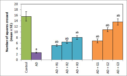 Fig. (1b). Effect of Rivastigmine (R) and Galantamine (G) on the Open-field Assay (OFA). The AD flies were allowed to feed on the diet supplemented with various doses of R and G and then assayed. [a-significant with respect to control, p<0.05; b-significant with respect to AD flies [AD: Alzhiemer’s Disease flies; R1, G1=0.1mM; R2, G2=1 mM; R3, G3=10 mM].