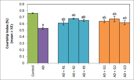 Fig. (1c). Effect of Rivastigmine (R) and Galantamine (G) on the courtship index (C.I.). The AD flies were allowed to feed on the diet supplemented with various doses of R and G and then assayed. [a-significant with respect to control, p<0.05; b-significant with respect to AD flies [AD: Alzheimer’s Disease flies; R1, G1=0.1mM; R2, G2=1 mM; R3, G3=10 mM].