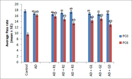 Fig. (1d). Effect of Rivastigmine (R) and Galantamine (G) on the Aversive Phototaxic of Drosophila melanogaster. The AD flies were allowed to feed on the diet supplemented with various doses of R and G and then assayed. [a-significant with respect to control, p<0.05; b-significant with respect to AD flies [AD: Alzhiemer’s Disease flies; R1, G1=0.1mM; R2, G2=1 mM; R3, G3=10 mM].